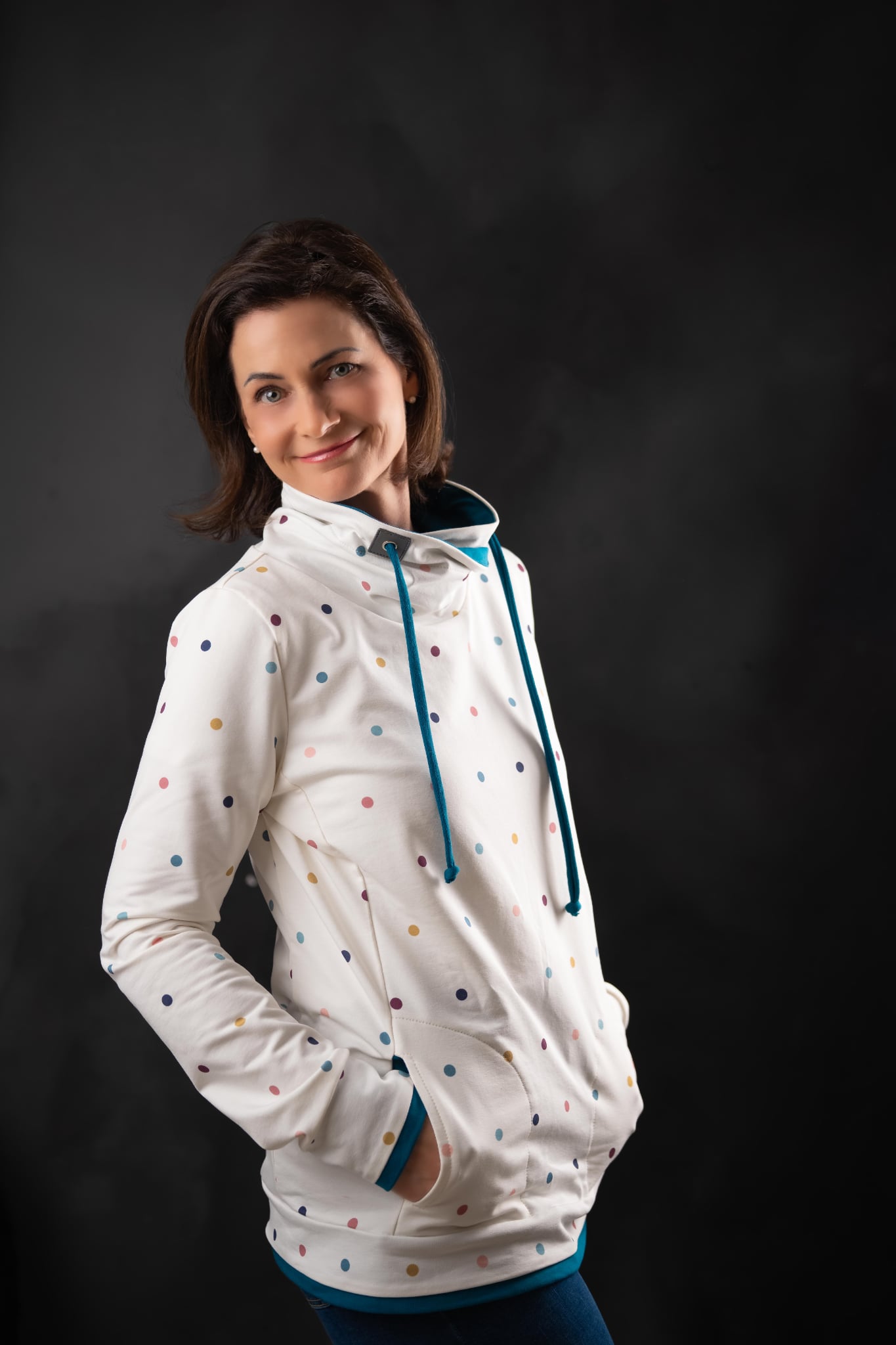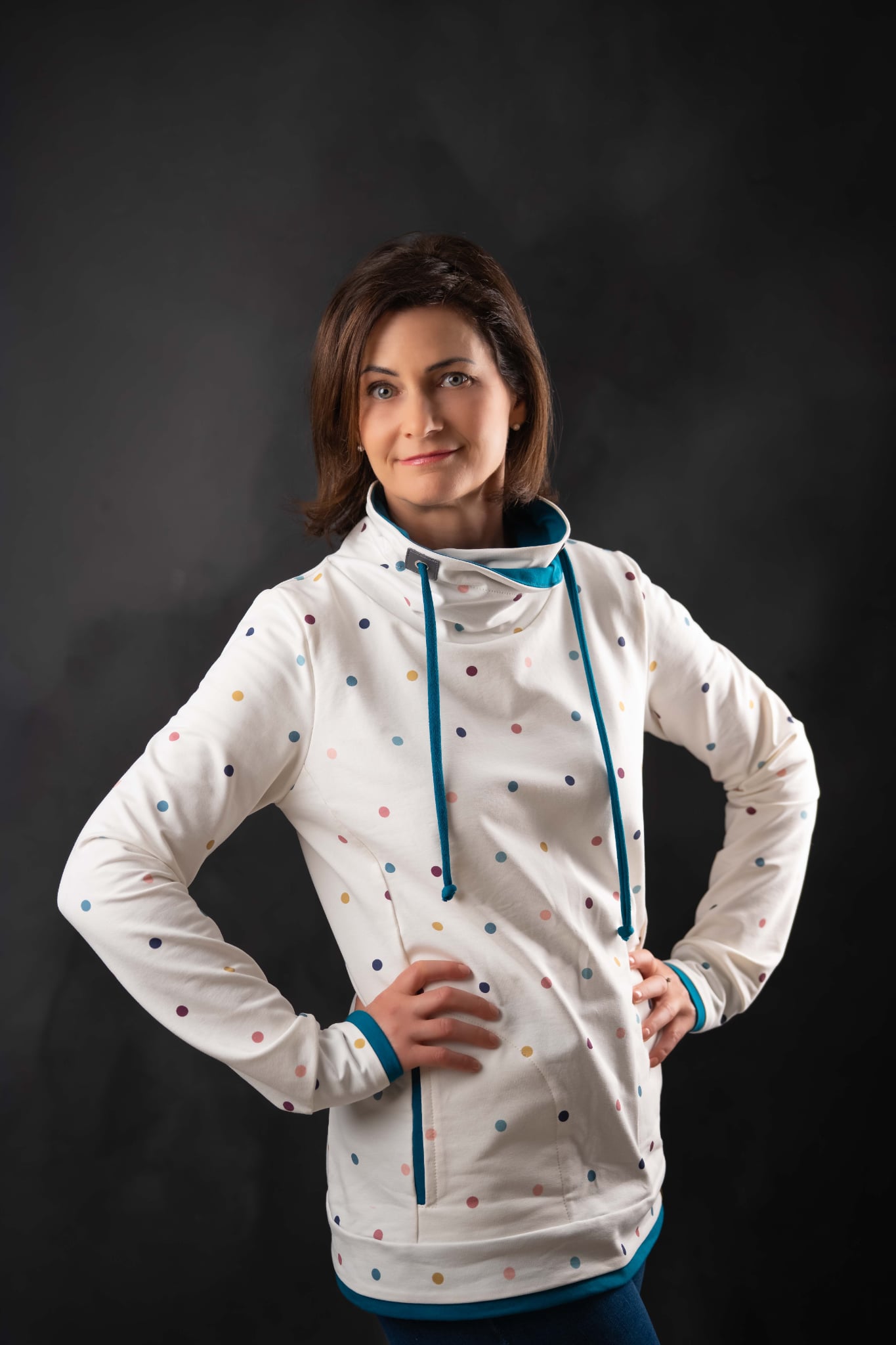 Szuper választás,ez a csípőig érő,hosszú ujjú nagyon vidám színes pöttyös pulcsi.