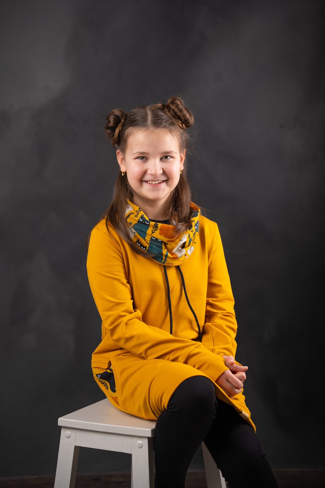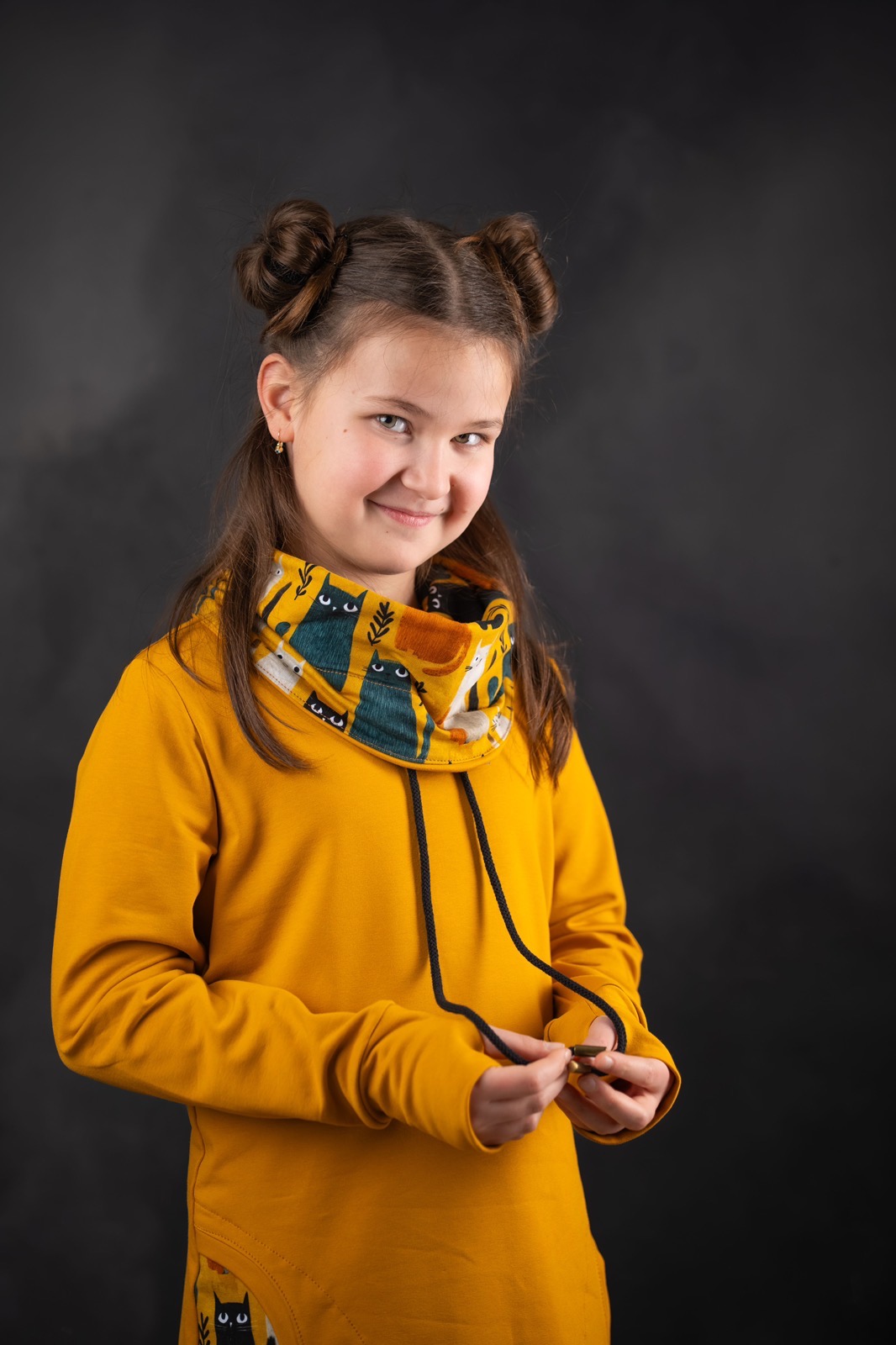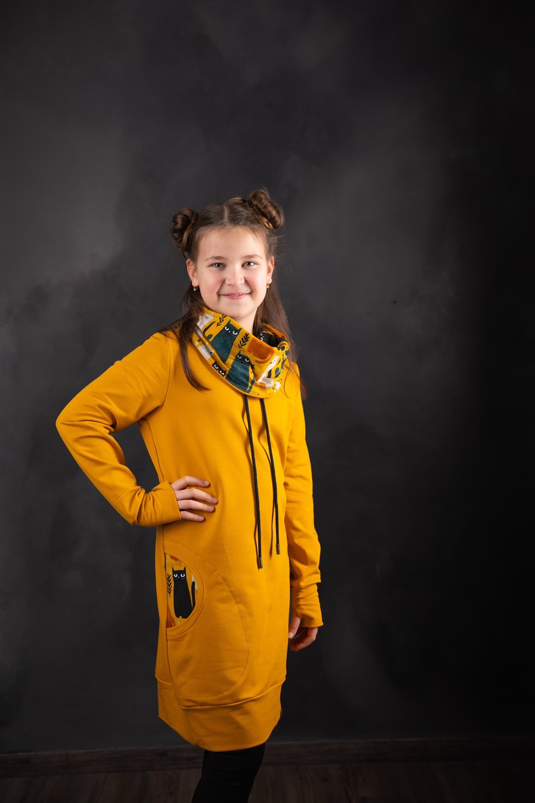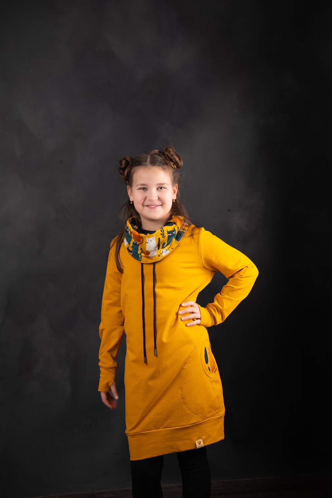 Hosszított fazonú,kámzsás kislány pulóver ami ruhaként is hordható.